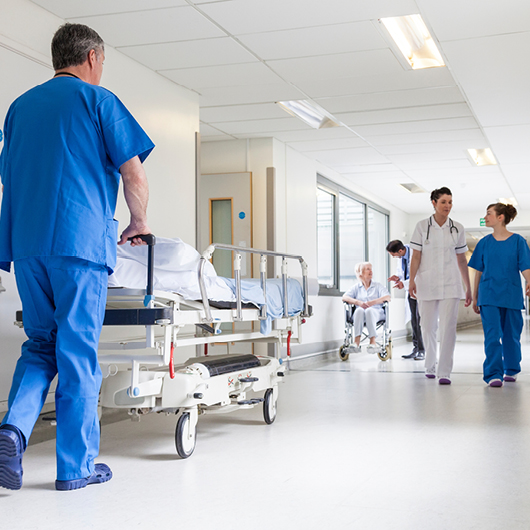 Hospital staff walking down hall